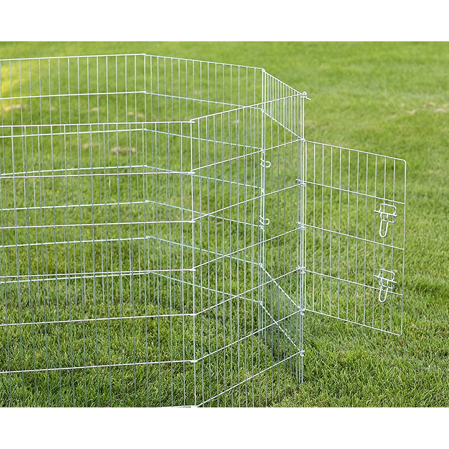 Prevue Pet Products Exercise Pen for Dogs 40142 is heavy duty and assembles easily, no tools required! 8 panel exercise pen features rust-resistant Bright Zinc finish over solid steel rods and includes grounding stakes. Ideal for small and medium sized dogs, each panel measures 24ÆÆ Wide and 42ÆÆ High. Front access door has 2 secure latches and measures 18 1/4" Wide and 23 1/4" High. Exercise Pen folds flat for storage or travel and measures approximately 57ÆÆ in diameter when assembled. To set it up simply take it out of the box, make sure the door is in the lower registry of the main panel, slide the connector pin (4 1/2" L) through the connection loops and it's good to go. Additionally, the 4 grounding stakes can be used to secure exercise pen into soil.